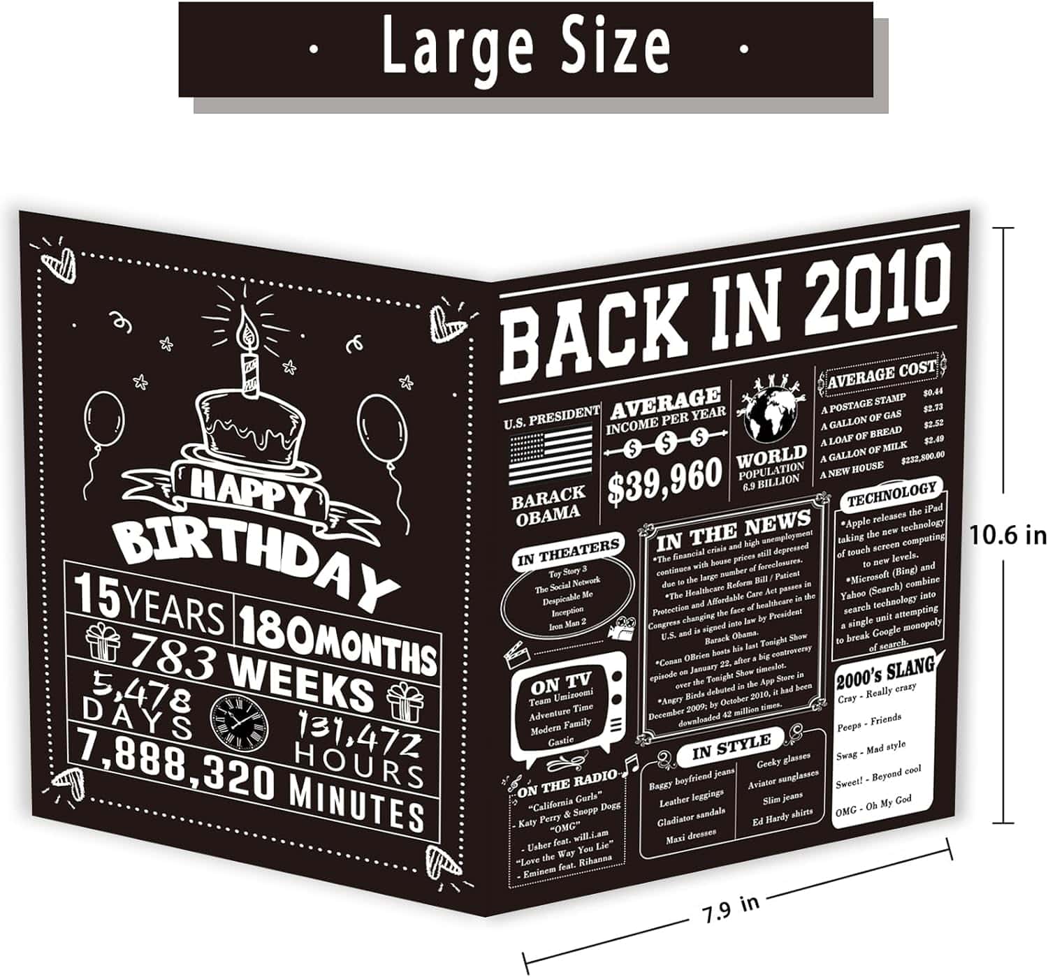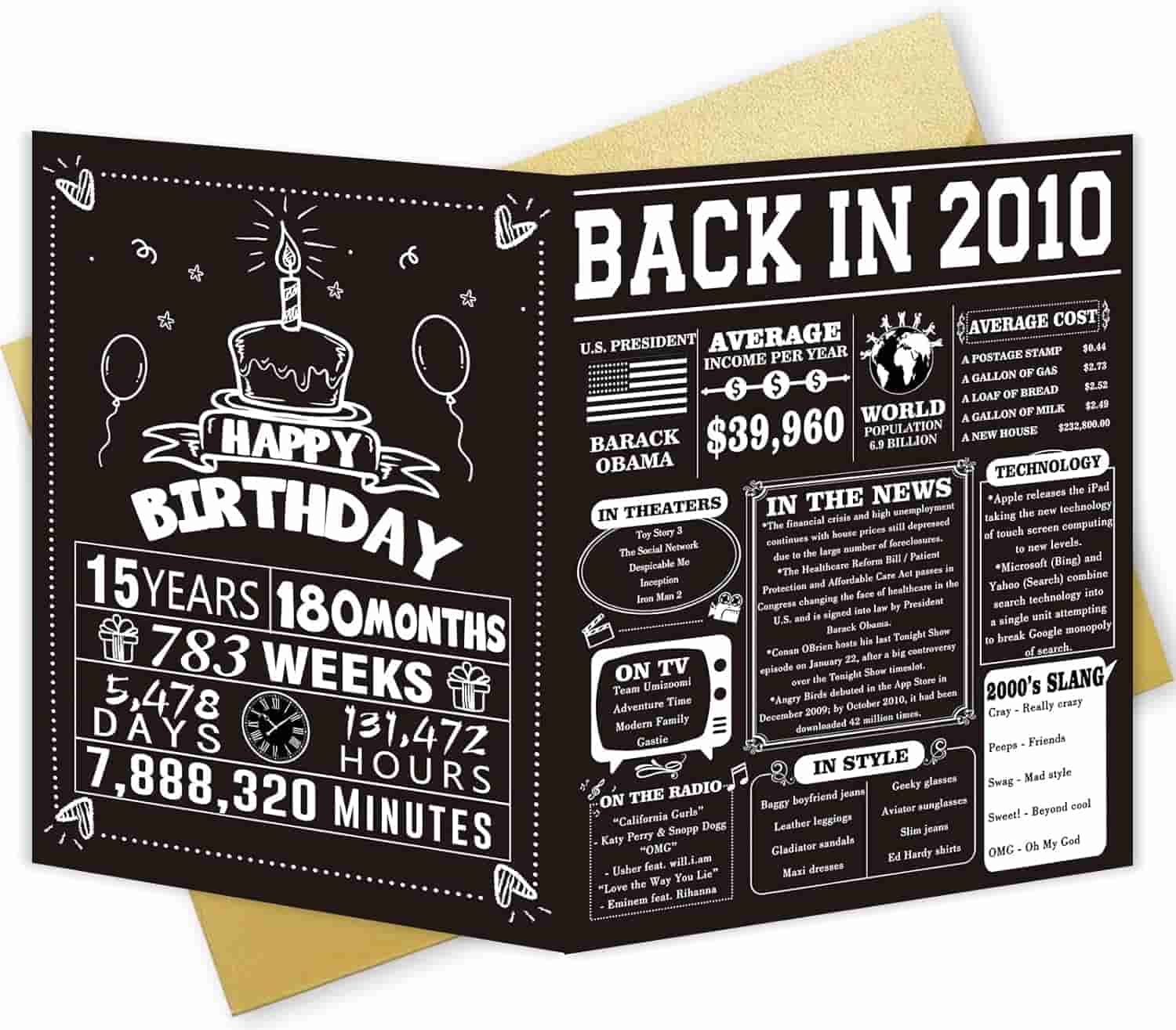 The charm of this card lies in its ability to spark engaging conversations. Pull it out during a birthday bash and watch as guests intrigued by its contents get transported back to a time of interesting facts and popular TV shows of 15 years ago. Serving as a photography prop and tabletop display, it seamlessly blends into party themes, ensuring it’s a conversation starter wherever it is displayed.