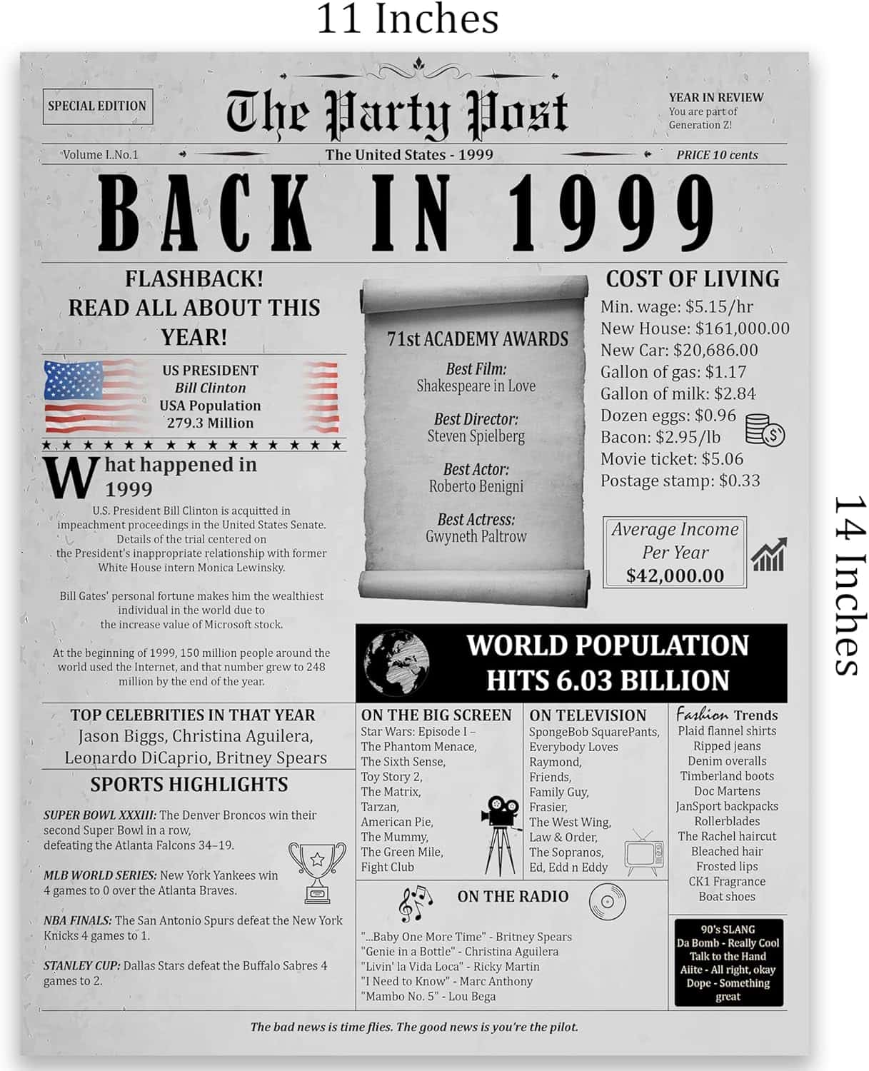Let me tell you about the ultimate party decoration for your 26th birthday celebration! Imagine this: the room is buzzing with excitement, laughter filling the air as guests marvel at the beautiful decorations. Right there on the table or hanging on the wall is the centerpiece— our Back in 1999 birthday poster. This isn’t just any poster; it’s a fantastic trip down memory lane, showcasing the most significant events, sports highlights, and fun facts from 26 years ago. Everyone will be captivated, and it will spark conversations that bring even more joy to your celebration!