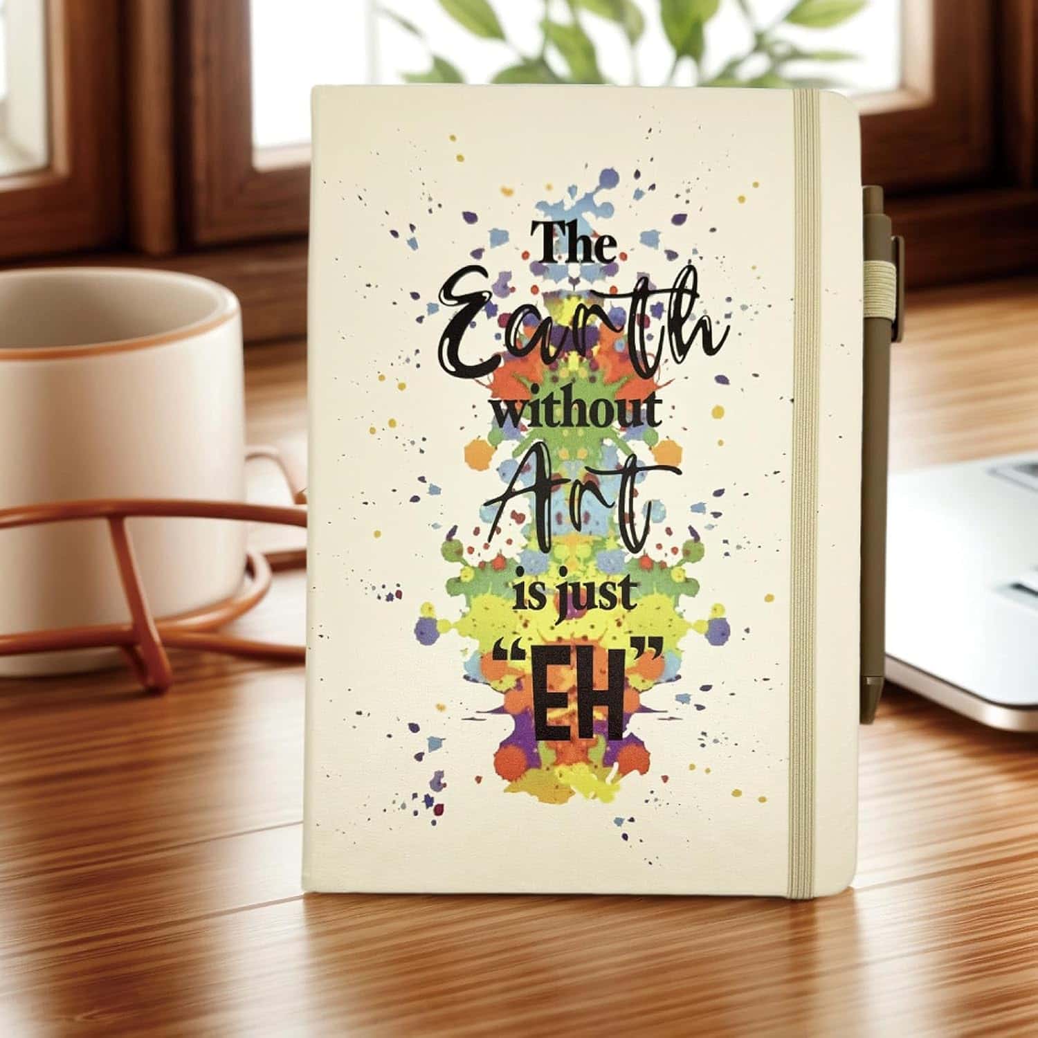 The journal cover is crafted from premium PU leather with a shiny gold inscription—“The Earth Without Art is Just Eh.” Its graceful size of 8.4”x 5.7” makes it easy to slip into tote bags, backpacks, or even a handbag. The notebook features 200 wide-ruled pages for extensive writing purposes and includes practical touches like an elastic pen loop, inner ribbon bookmark, and elastic closure band. The accompanying art-themed keychain, adorned with painter-inspired charms, is made of durable alloy, while the cute ballpoint pen, smooth to write, features sturdy plastic construction and 0.5 mm quick-drying black ink.