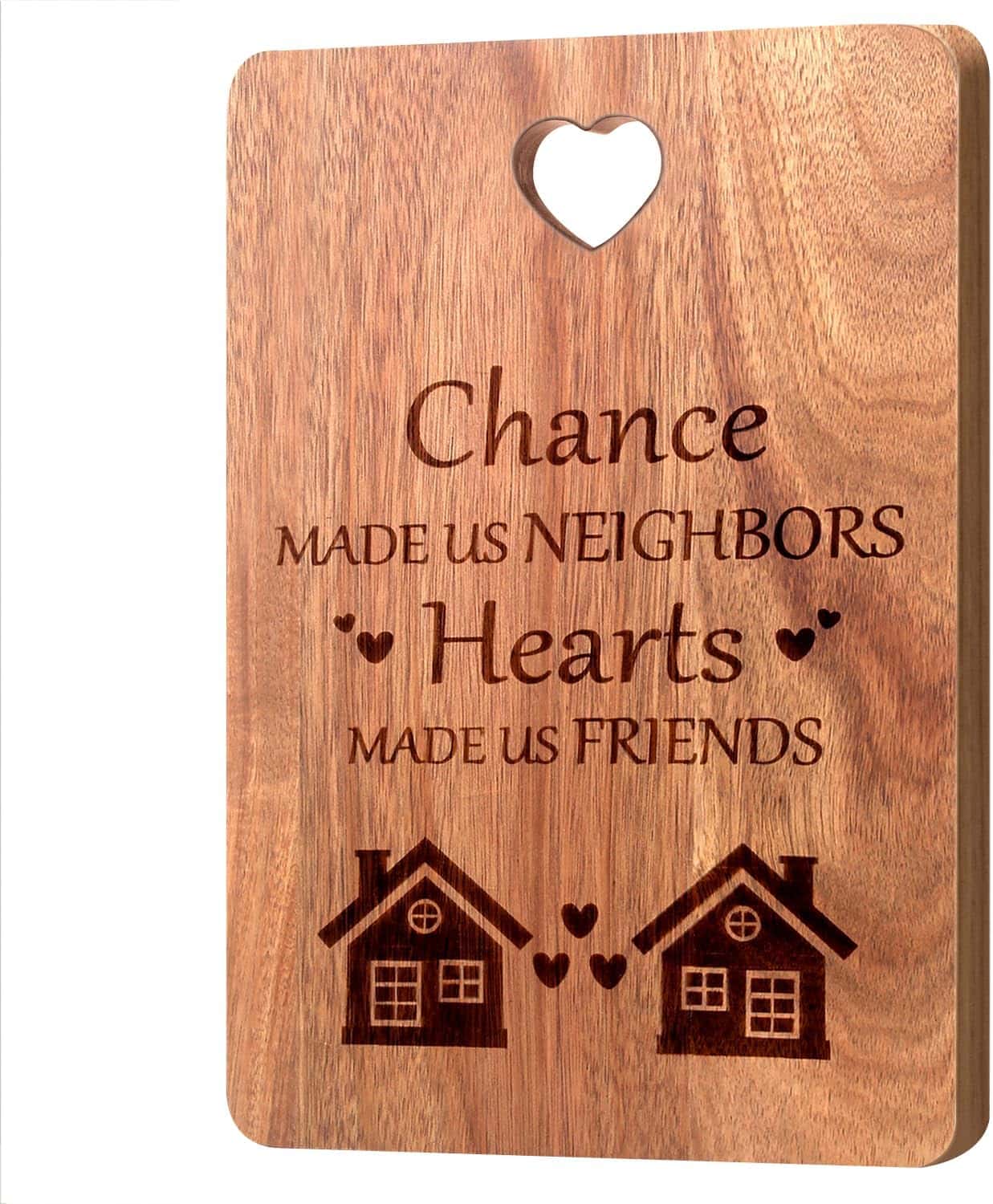 This acacia wood cutting board is a thoughtful and versatile gift perfect for neighbors and friends, especially those moving away or celebrating a housewarming. Its beautiful design and smooth surface make it ideal for chopping or displaying snacks. With a heartfelt quote, it’s a lovely keepsake and a charming kitchen decoration, suitable for anyone who appreciates quality and style.