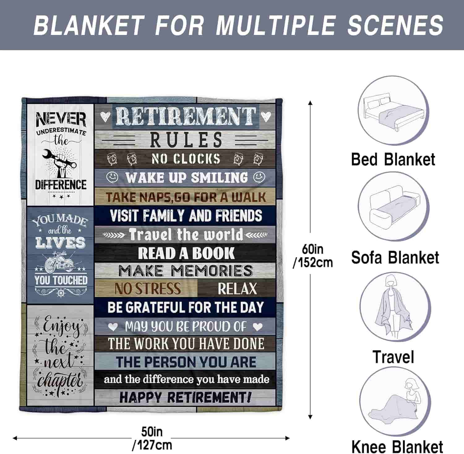 Each fiber of our retirement blanket speaks volumes of sophistication. The exquisite material, the vibrant colors showcasing decorative charm, and the 60″x50″ size marry practicality with beauty. As you run your fingers across its soft texture, you’ll recognize the tangible quality found in each weave. This blanket isn’t just made; it’s tailored with memories of quality craftsmanship that you can see, touch, and even imagine the cozy embrace it offers.
