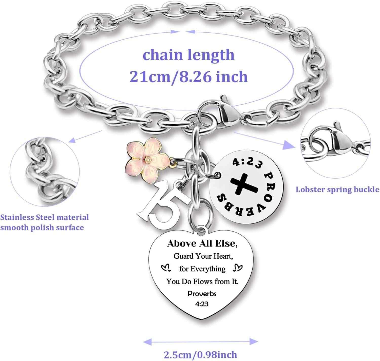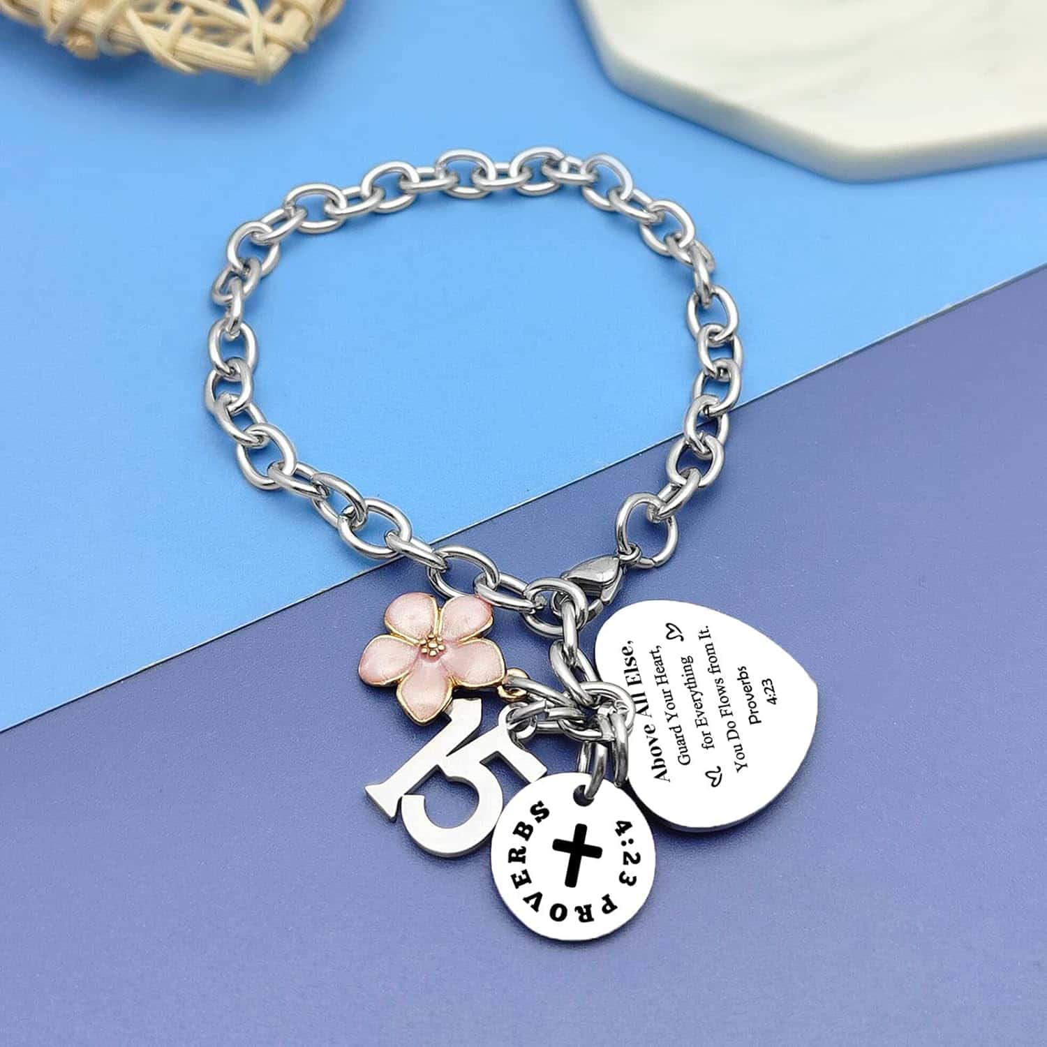 The DlaeKua Birthday Charm Bracelet is a heartfelt gift, perfect for celebrating a girl’s 15th birthday. This stainless steel bracelet is engraved with a meaningful Proverbs quote, making it both beautiful and inspiring. Its durable and tarnish-resistant material ensures it will last. This bracelet is ideal for daughters, granddaughters, sisters, or best friends, offering them a symbol of love and good fortune. Elegantly packaged, it’s ready to give for birthdays or other special occasions.