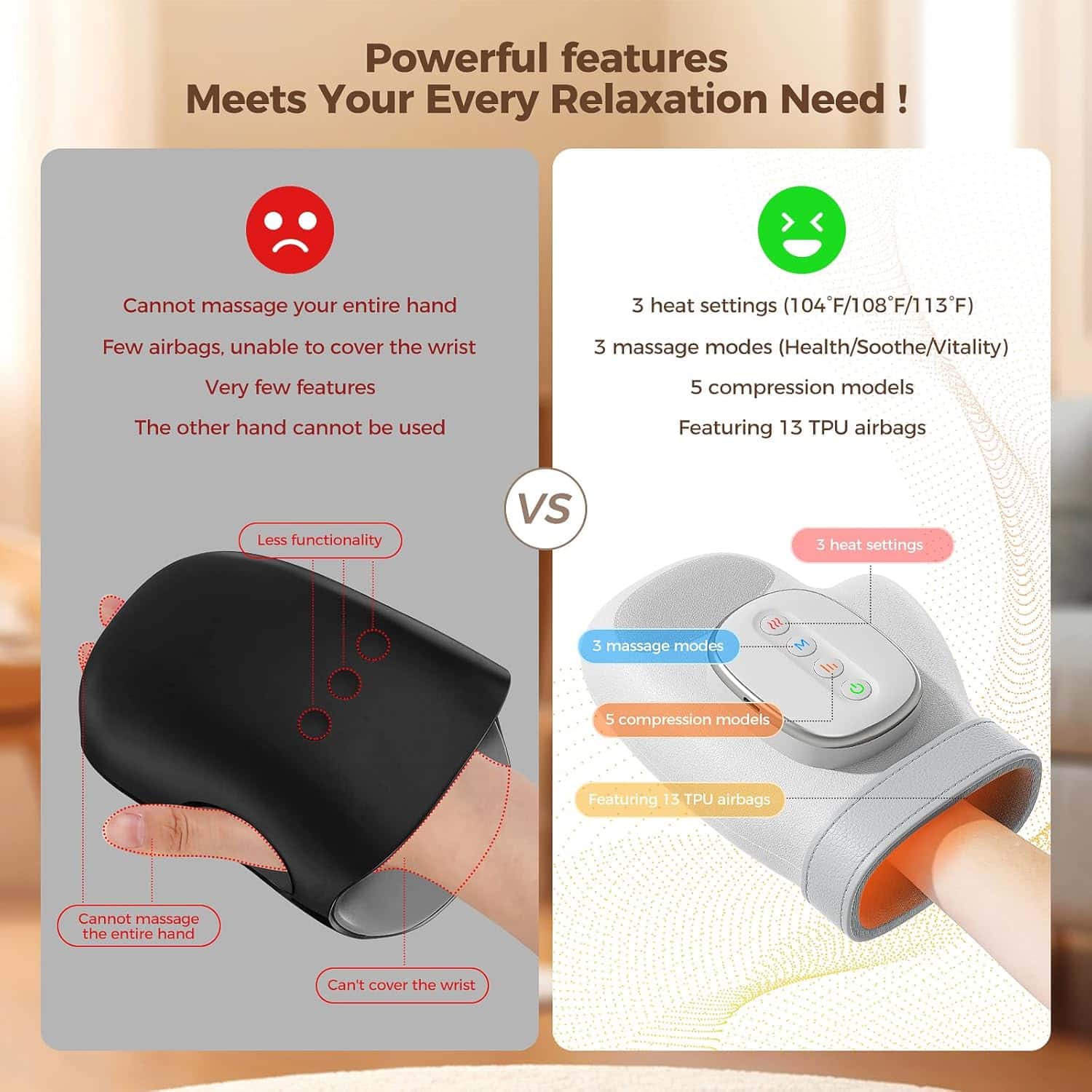 1. Comprehensive Hand Care: Relief for carpal tunnel, arthritis, and hand fatigue with targeted pressure and heat. 2. Customizable Comfort: 13 airbags, 3 massage modes, 3 heat settings, 5 compression models for a personalized relaxation experience. 3. Efficient Design: Quick heat-up, 15-minute auto shut-off, 2000mAh battery, and Type-C charging for convenient weekly use. 4. Premium Materials: Durable PU leather, soft tech fabric interior for skin-friendly comfort and maximum longevity. 5. Thoughtful Gift & Support: Ideal for loved ones seeking hand relief; lifetime online support and free replacement for quality issues.