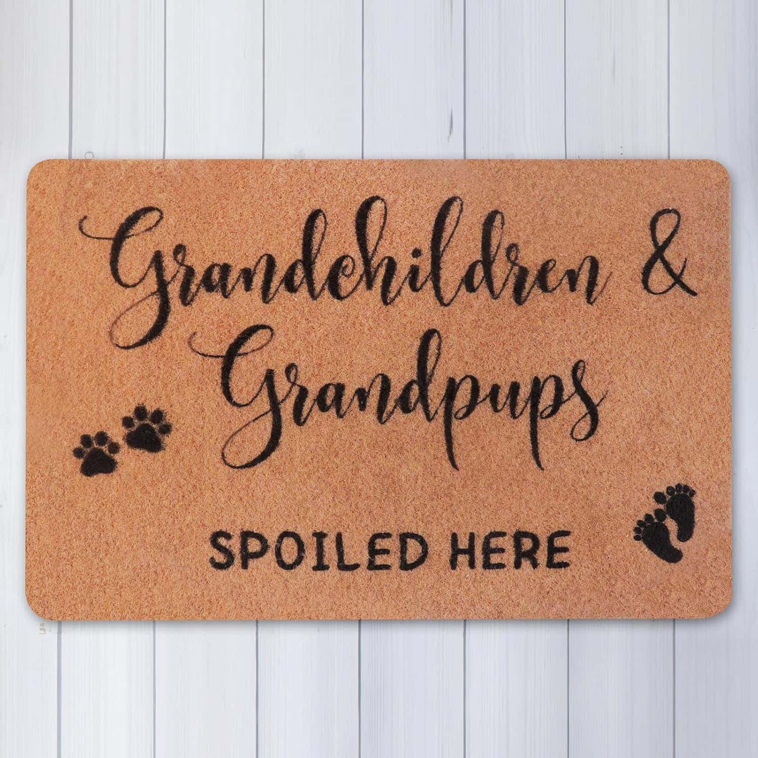 Picture this: it’s a cozy Sunday morning, and your grandma is sipping her favorite tea. Suddenly, her doorbell rings. Surprise! It’s her grandkids and grandpups, greeted by a charming doormat that boasts, “Grandchildren & grandpups spoiled here.” This delightful scene becomes possible with our special doormat, designed with love and thoughtfulness to honor the beautiful bond between your grandma and her grandkids!