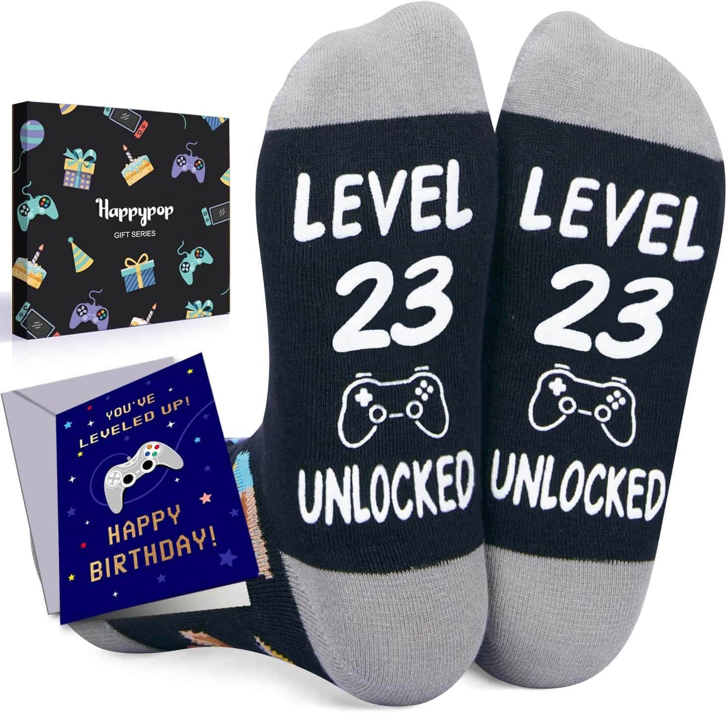 Let me introduce you to the charming world of the HAPPYPOP 23rd Birthday Gifts Socks! Imagine pulling these wonderfully soft socks from their exclusive gift box. Made from 80% cotton, they offer a gentle hug for your feet, while 15% nylon and 5% spandex provide just the right stretch and durability. Adorning the socks are delightful birthday motifs like gifts, hats, cakes, and balloons. The real surprise? The bottom features a hilarious message in non-slip ink: “LEVEL 23 UNLOCKED” – how fun!