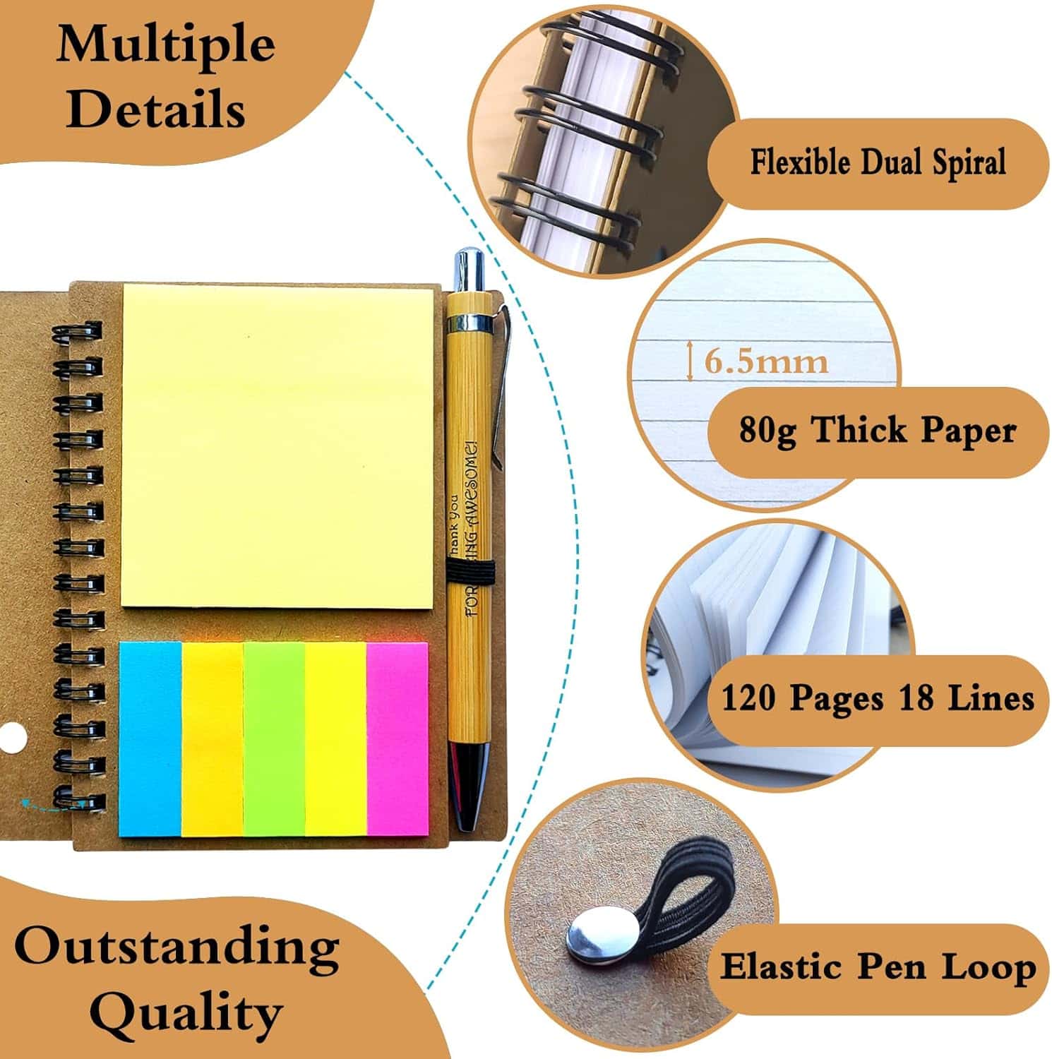 Imagine the feeling of holding a thoughtfully crafted Inspirational Spiral Notebook in your hands. Its tangible features speak for themselves. The use of sturdy kraft paper offers durability and a tactile experience like no other. The compact size (5.31″ x 4.33″) ensures that it fits seamlessly into your daily life, ready to capture a fleeting thought or to jot down meeting minutes. The decorative allure of the matching bamboo pens adds an eco-friendly touch, while the inclusion of sticky notes transforms it into a dynamic tool for organizing ideas.