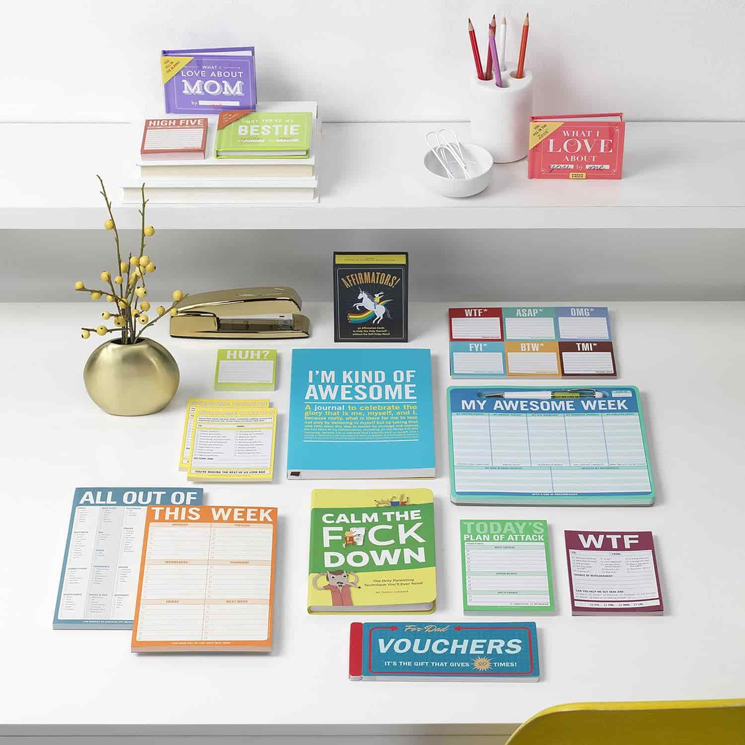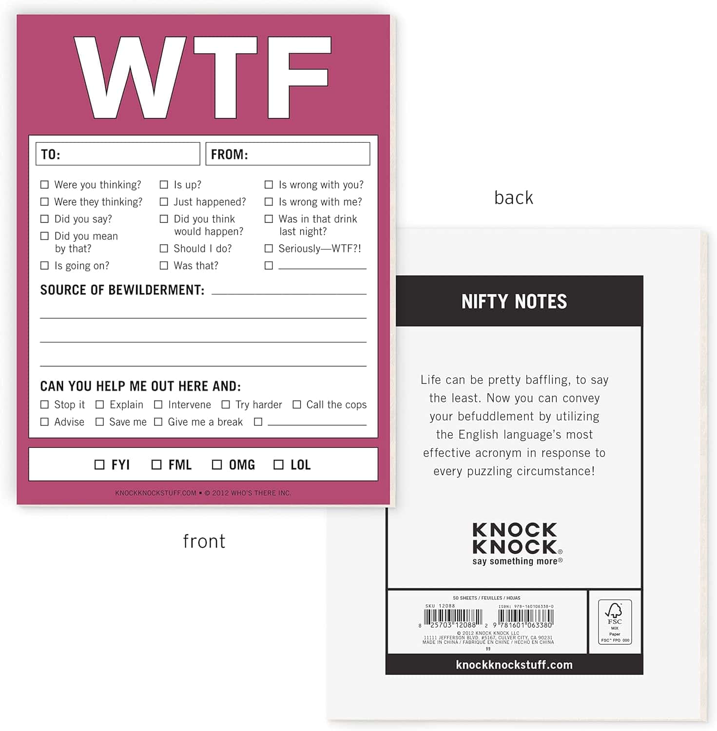 Spell out your befuddlement in the midst of any circumstance (while also channeling pent-up frustration) with the English-speaking world’s most expressive acronym and the simple check of a box or two. It’s the ultimate FYI. Never be at a loss for words again with the WTF Nifty Note from Knock Knock! A favorite office gift for coworkers, or funny notepad gifts for adults, and family members or friends. It includes one notepad (4 x 5.25 inches), with 50 sheets each. Knock Knock is an independent maker of clever gifts, books, and whatever else they can think up. Our mission is to bring humor, creativity, and smarts to everyday life. Put the fun in functional with Knock Knock stuff.