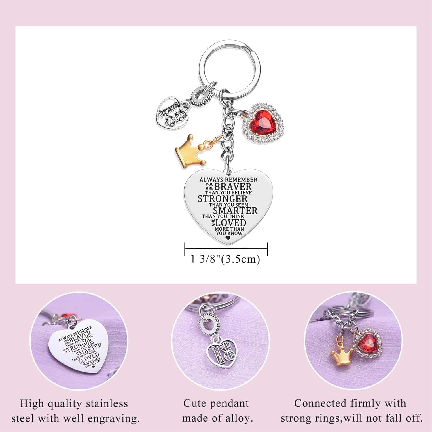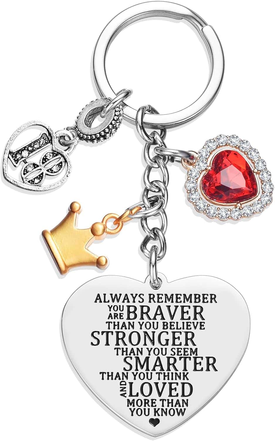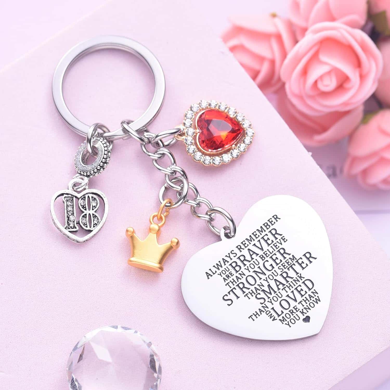 ### 18th Birthday Keychain Gift: 1. Meaningful Design: Heart-shaped pendant with motivational engraving: “BRAVER THAN YOU BELIEVE, STRONGER THAN YOU SEEM, SMARTER THAN YOU THINK, AND LOVED MORE THAN YOU KNOW.” 2. Daily Reminder: Perfect for keys, backpacks, or diaries; offers daily motivation. 3. Gift for Loved Ones: Ideal for daughters, granddaughters, nieces, sisters, or best friends. 4. High-Quality Material: Includes alloy crown and number 18 pendants, cubic zirconia heart; heart pendant in rust-resistant 314L stainless steel. 5. Ready for Gifting: Comes with a jewelry box; convenient size for easy key identification and secure attachment.