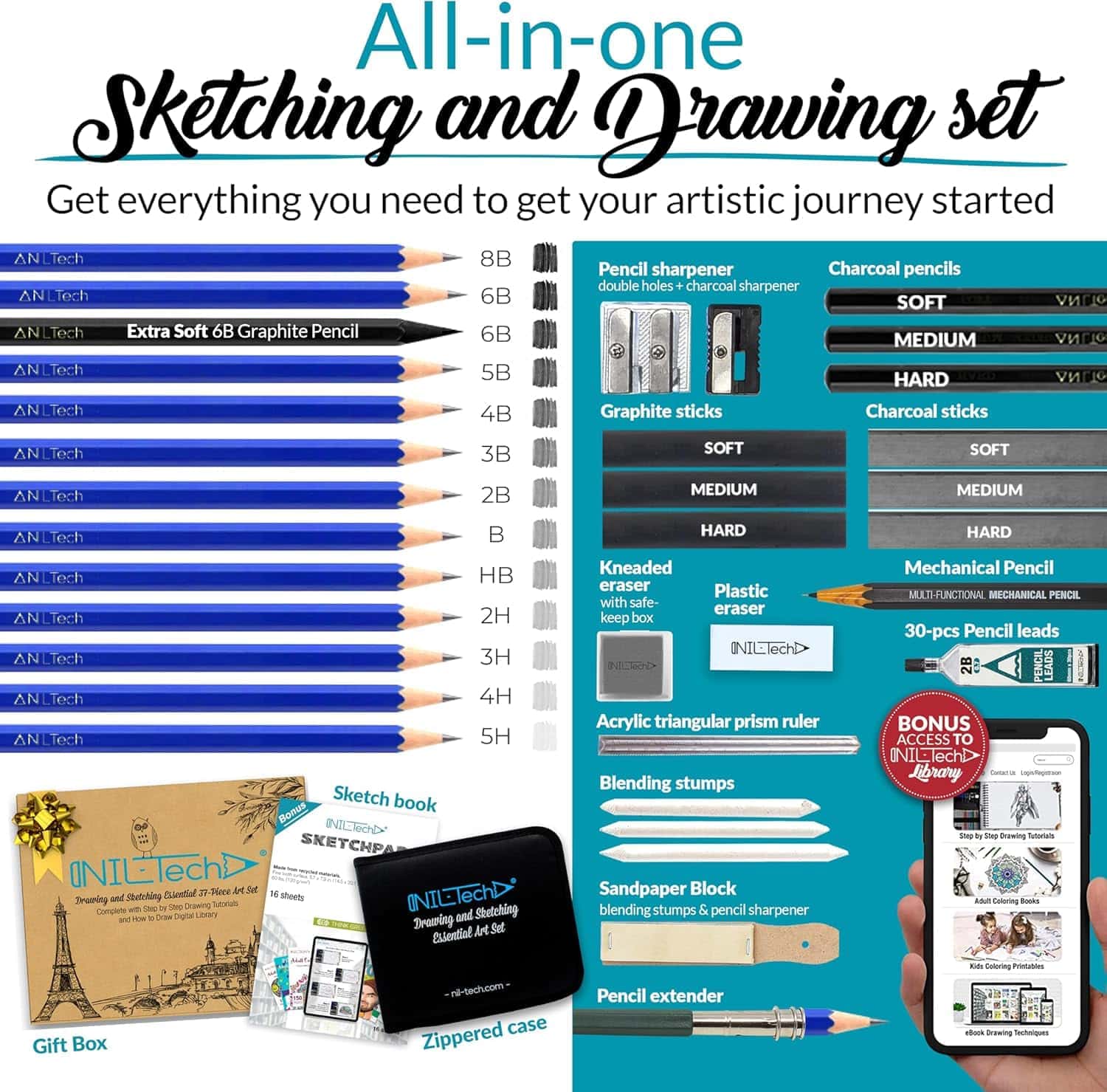 The NIL TECH 37-Piece Premium Shading Pencils set is the perfect gift for artists of all levels, from beginners to professionals. With a range of pencils and tools, this set enhances your creativity and precision in sketching. Ideal for birthdays, holidays, or special occasions, it’s great for art students, hobbyists, or anyone passionate about drawing. The included tutorials and sketch pad make it a thoughtful and practical gift for aspiring artists.