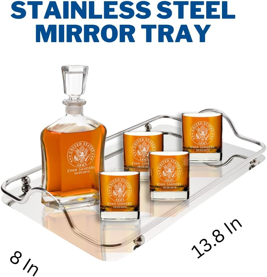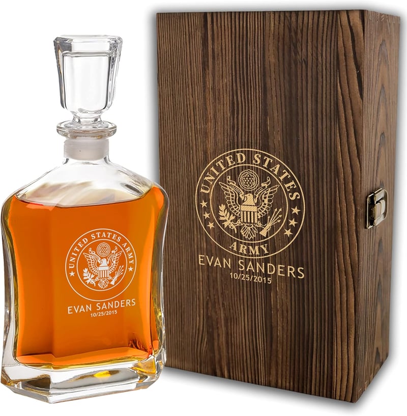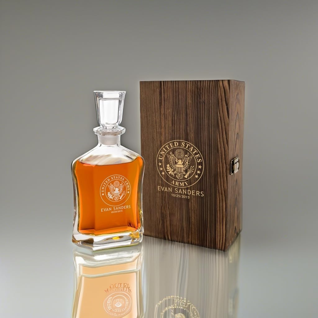 This personalized military decanter is the perfect gift for honoring service members. The custom engraving adds a special touch, making it a heartfelt keepsake. With an optional wooden box, it sets a distinguished tone, ideal for celebrating military accomplishments or retirements.