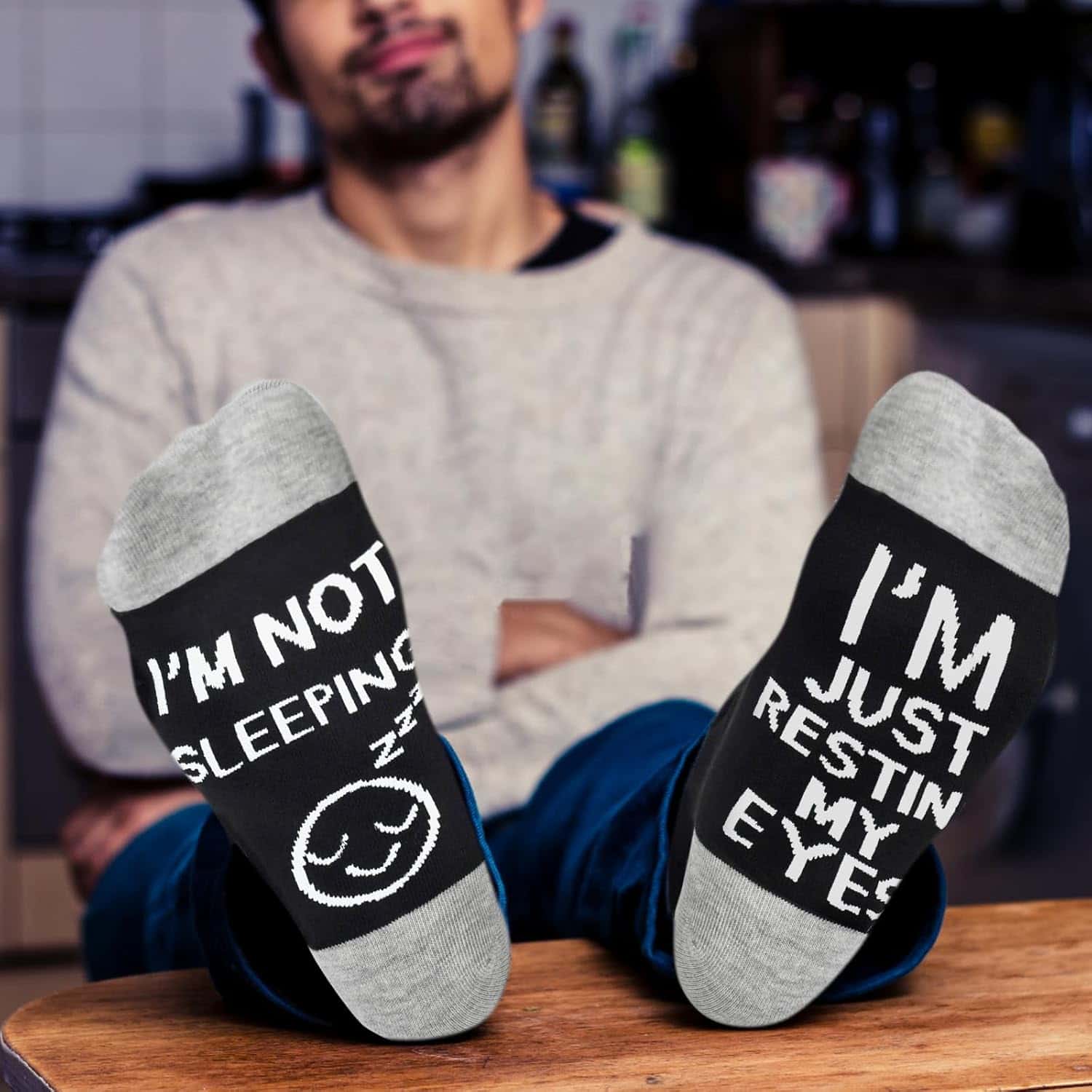 Why should you choose these socks over any others? Our socks provide unmatched comfort and durability. The clever hidden message on the soles—“I’M NOT SLEEPING I’M JUST RESTING MY EYES”—brings a smile to anyone who sees it and adds a humorous touch to your relaxation time. Whether lounging on the couch or enjoying a well-deserved break, these socks are the perfect companion. They make an excellent conversation starter and are guaranteed to infuse fun into any gathering.