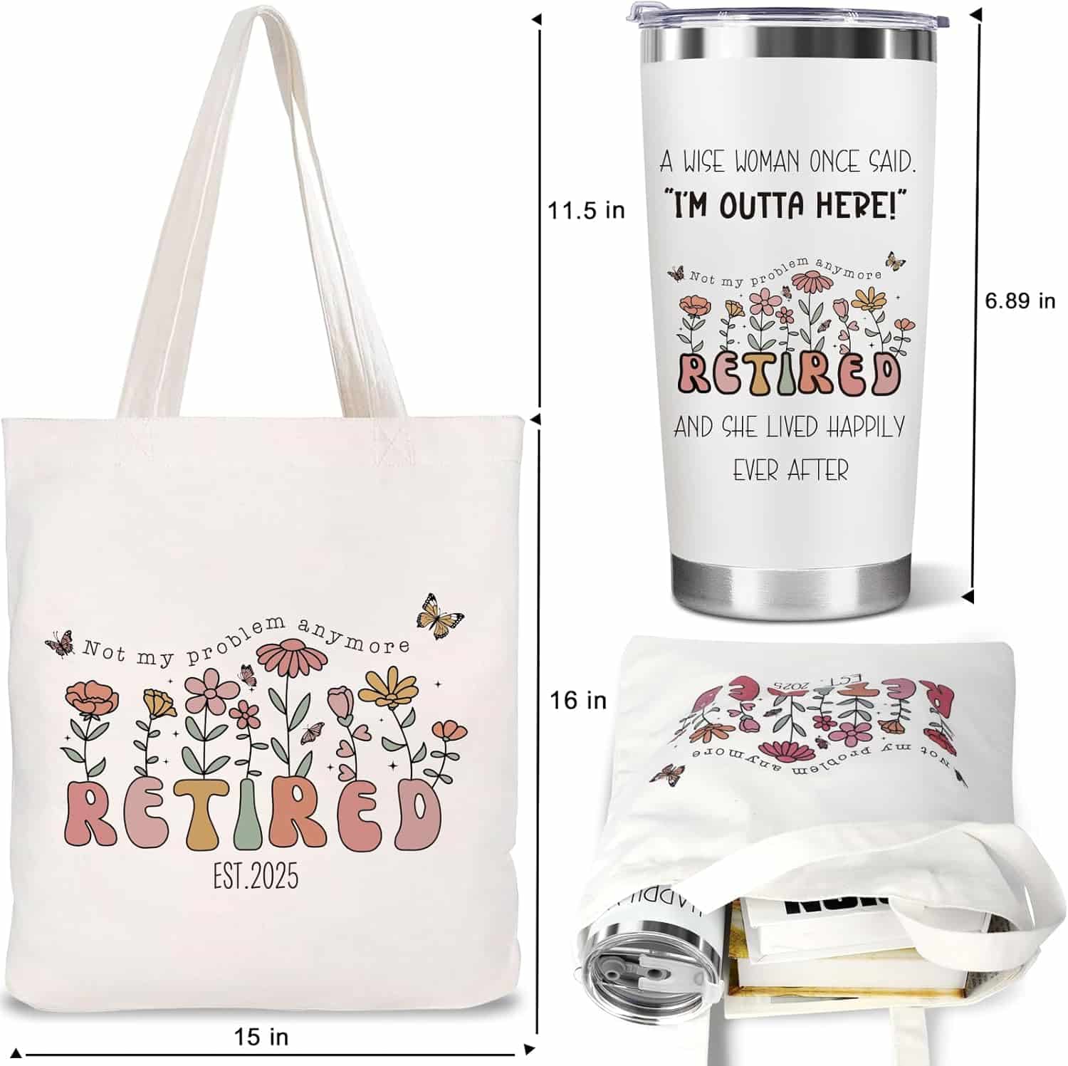 Imagine unwrapping a beautifully crafted retirement gift set – a stylish canvas tote bag and an insulated tumbler, each with witty quotes that promise to bring joy. The canvas tote is tangible proof of quality and functionality, with its durable fabric and clean, white finish, ideal for her daily excursions. Picture the tote bearing the bold inscription, “NOT MY PROBLEM ANYMORE. EST. 2025,” offering a constant reminder of her well-earned retirement. Meanwhile, the insulated tumbler is sleek and practical, keeping her favorite beverages at the perfect temperature, and it proudly features the cheeky quote, “A WISE WOMAN ONCE SAID ‘I’M OUTTA HERE!’ AND SHE LIVED HAPPY EVER AFTER.”