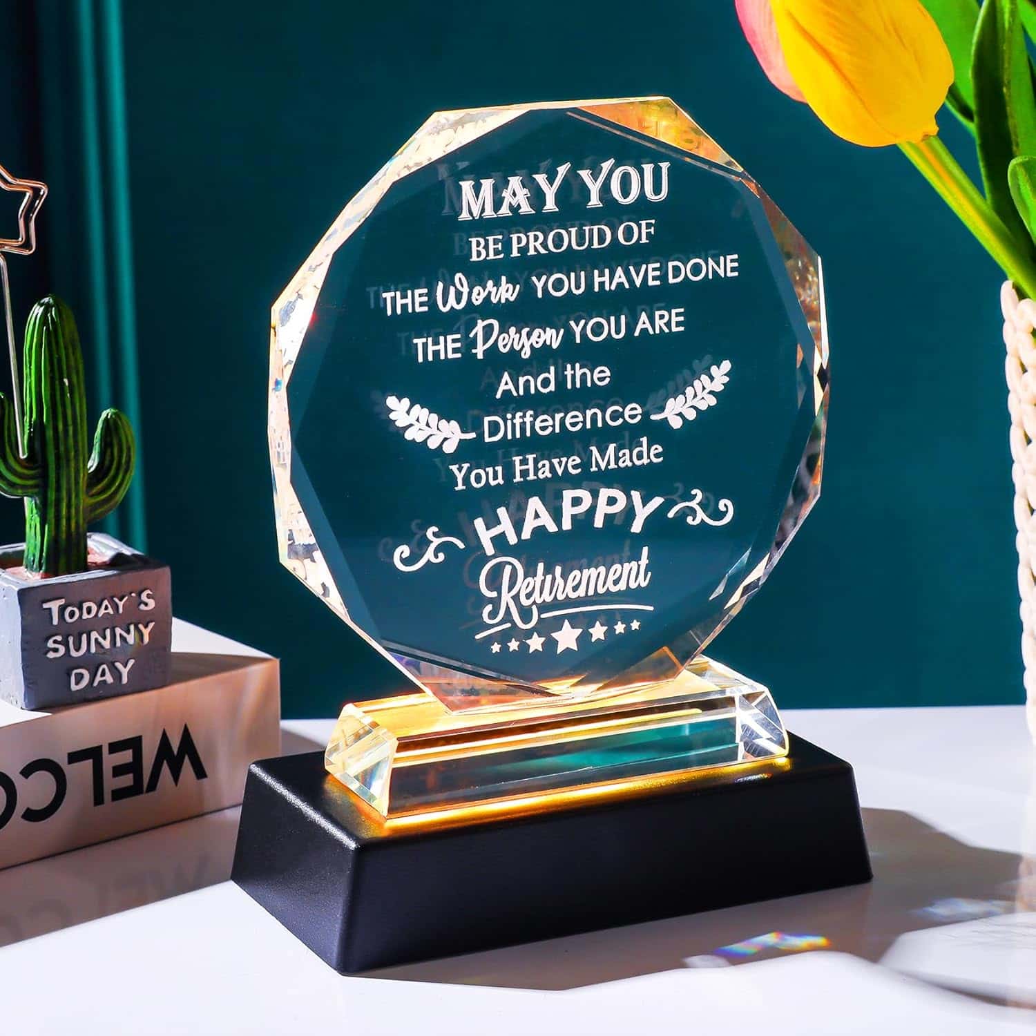 Are you on the hunt for a meaningful retirement gift? Allow me to introduce you to the exceptional YWHL Retirement Gifts with LED Base Crystal Keepsakes. Its exquisite design and heartwarming engraved words make it a truly memorable gift, celebrating the enormous contributions of the retiree. Picture this: The plaque stands proudly on a desk, illuminated beautifully, reminding its owner of a successful career and emotional milestones!