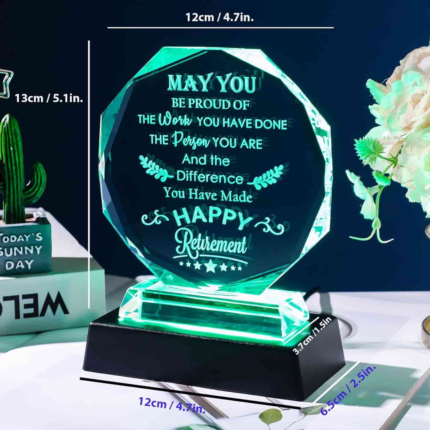 The YWHL Retirement Crystal Keepsake is a thoughtful gift perfect for anyone approaching retirement, including teachers, police officers, nurses, doctors, and coworkers. Made of high-quality glass with laser-engraved words that won’t fade, it serves as a lasting memento of their achievements and contributions. The LED base enhances its visual appeal, making it suitable as both a decorative piece and a night light. It comes in an elegant gift box, making it ready for gifting.