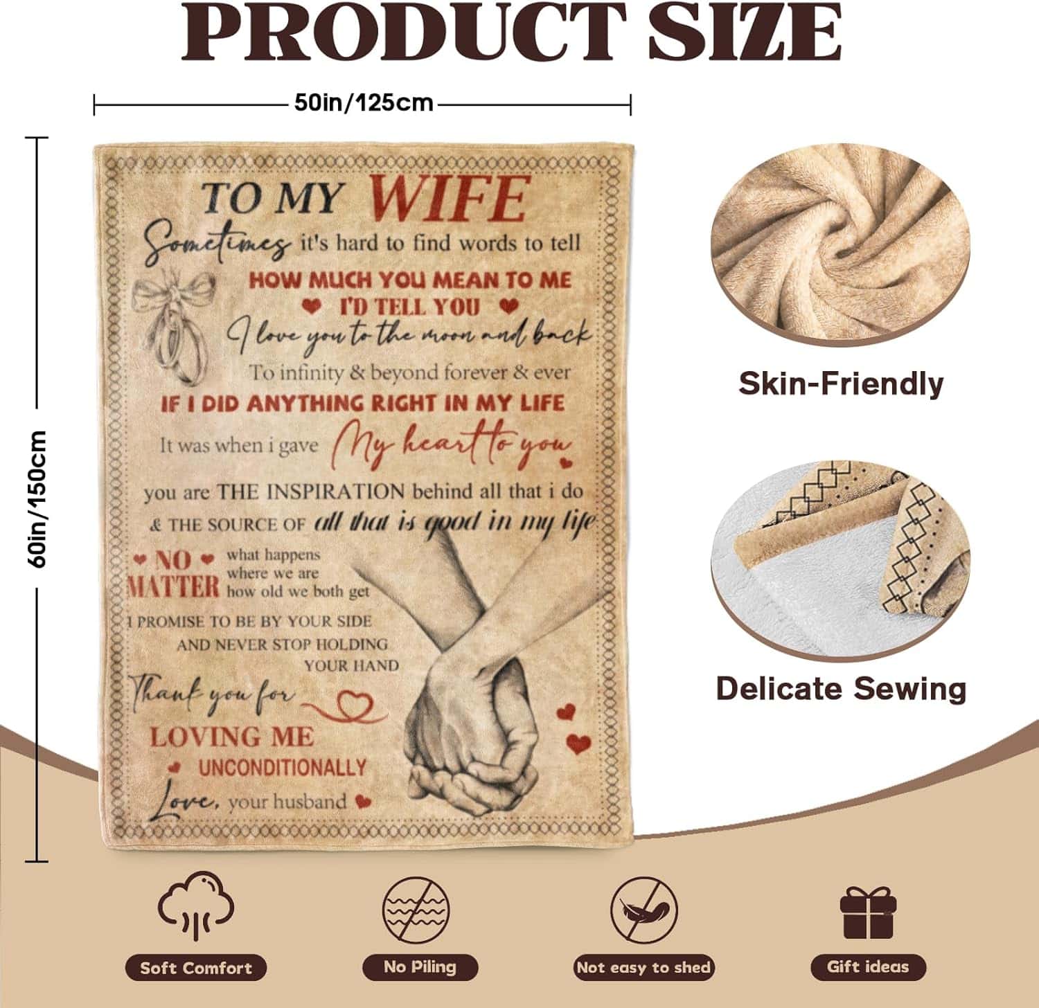 1. Romantic Fleece Blanket: Celebrate your bond with this soft, cozy blanket, embodying love, warmth, and affection. 2. Thoughtful Wife Gift: Perfect for anniversaries, weddings, or expressing love, this blanket symbolizes lasting appreciation. 3. Versatile Keepsake: Ideal for anniversaries, Valentine’s Day, or relaxing moments, it represents comfort and connection. 4. Premium Quality Blanket: 50″x60″ flannel fleece is breathable, durable, and machine-washable for long-lasting softness. 5. Easy Care Design: Fade-resistant, quick-drying, and wrinkle-free; designed to stay plush and hassle-free forever.