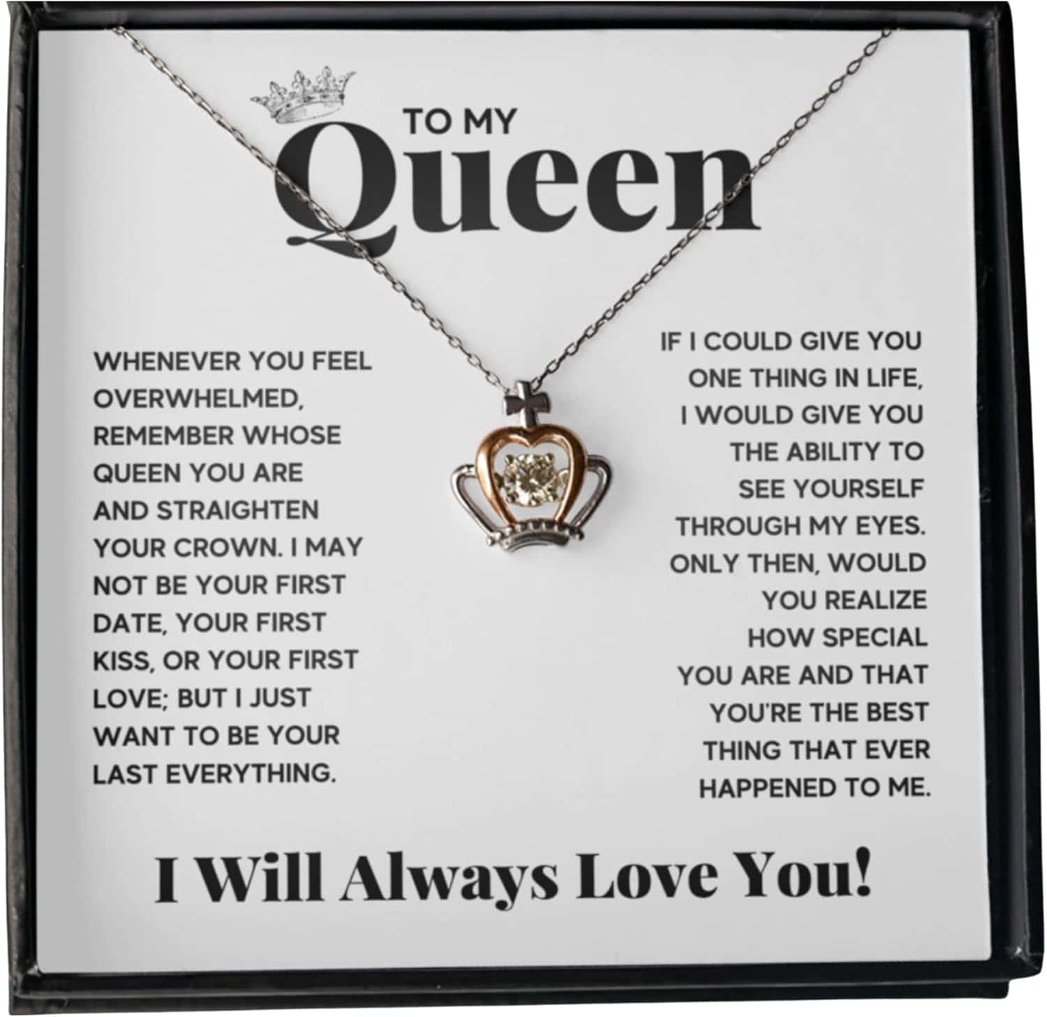 1. Timeless Keepsake Gift: Premium quality jewelry with a special message; ideal as a thoughtful necklace gift for your soulmate; includes a gift box. 2. Inspirational Message Card: Symbolizes eternal love and an unbreakable bond; a trending favorite; perfect for surprising your loved one. 3. Versatile Occasions: Suitable for soulmates, wives, fiancées, future wives, boyfriends, and family. 4. Big Surprise Impact: The item is not small; it provides a significant, heartfelt surprise for recipients.