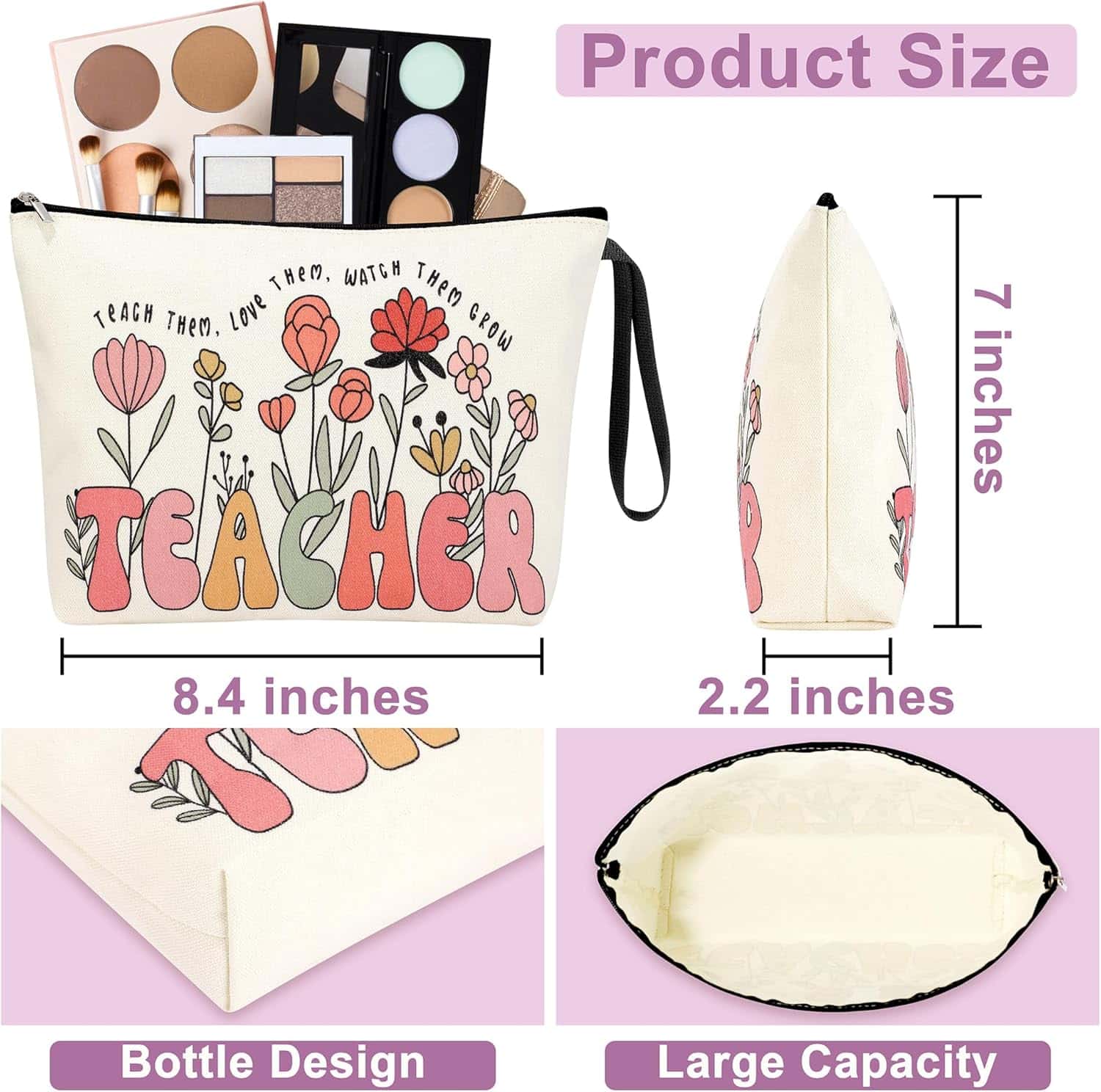 – Product Overview: The 5-piece Teacher Appreciation Gift Set includes a 16 Oz glass can with lid and straw, a high-quality canvas makeup bag, a stainless steel keychain, two wooden bead bracelets, and an “Amazing Teachers” message card. – Purpose: Express your love and gratitude to teachers for their hard work, knowledge, and guidance. – Features: – Glass can: Easy to clean, maintains drink taste. – Makeup bag: High-quality canvas, showcases charm. – Keychain: Stainless steel, conveys feelings. – Bracelets: Wooden bead with apple and letter motifs. – Message card: Features “Amazing Teachers” design; blank inside for personal messages. – Gift Appeal: Ideal for showing gratitude, it lights up her face with joy and underscores her special role. – Customer Service: Dedicated to ensuring a pleasant shopping experience; contact for any inquiries.