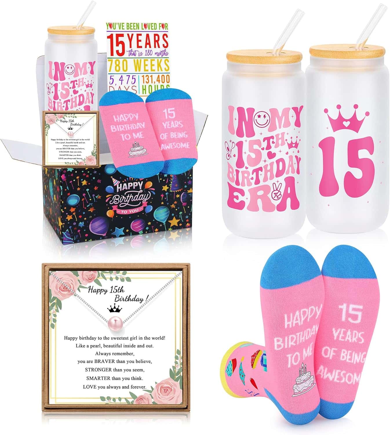 This charming 15th birthday gift set offers a blend of style and sentiment, perfect for a beautiful teenage girl. It includes a trendy can glass, cozy cotton socks, a heartfelt card, and a stylish pearl necklace, creating a memorable experience. Ideal for parents, friends, or relatives looking to express love and affection, it’s a meaningful gift that she’ll cherish.