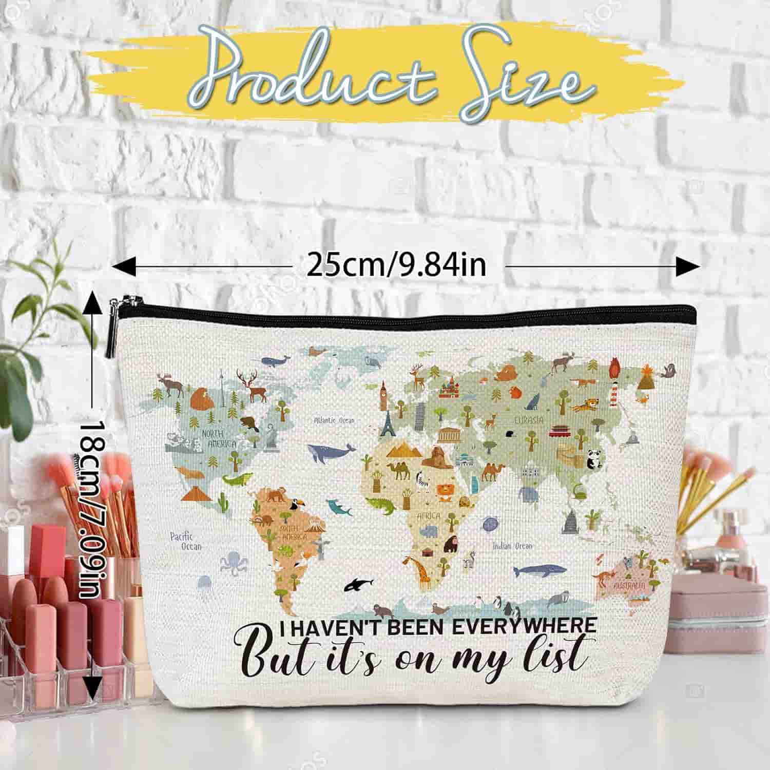 1. Unique Travel Map Design: Aesthetic travel map and quote for stylish women travelers. 2. Travel Must Haves: Compact toiletry bag with large capacity for travel essentials and souvenirs. 3. High Quality Canvas: Durable, waterproof canvas makeup bag, easy to clean and protects items. 4. Multi-Functional: Versatile use as a makeup, travel, or organizer bag for various occasions. 5. Suitable Occasion: Ideal gift for travel-loving women for birthdays, holidays, and special events.