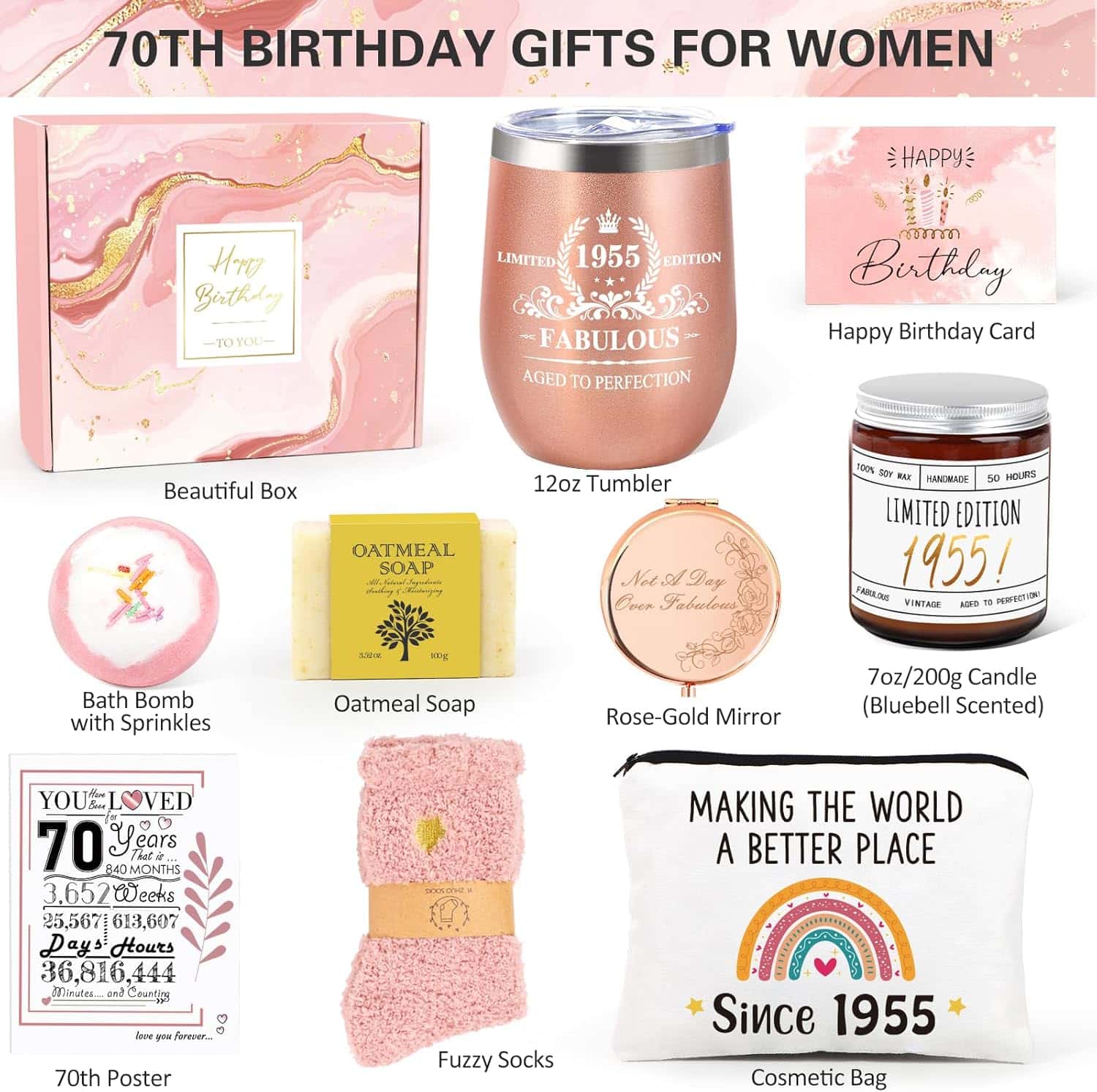 This 9-piece gift set is perfect for celebrating a special woman’s 70th birthday. It’s designed for moms, grandmas, aunts, and friends who appreciate thoughtful and practical gifts. The set includes items like a cozy tumbler, a stylish makeup bag, and a soothing bath bomb, making her feel loved and cherished on her special day.
